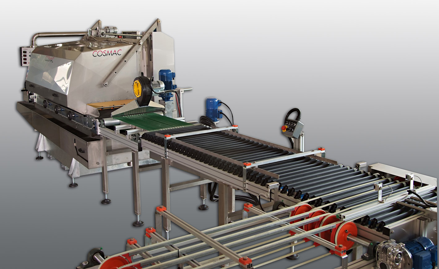La linea automatica per taglio mosaico è da sempre il nostro punto di forza, unito all'affidabilità e alla precisione delle nostre macchine da taglio e alla movimentazione del materiale. La linea è composta da: un nastro ALV per l'alimentazione automatica alla macchina da taglio, seguendo poi con il trasporto all'uscita della macchina dei listelli o a qualsiasi altro materiale tagliato, arrivando al rinvio a squadro ??B90?, questo ha la funzione di alimentare la seconda macchina da taglio e la fase di rinviare di 90 gradi i listelli e trasportarli alla macchina; questa è la cosa più importante perché richiede la massima precisione per ottenere un prodotto finito di alta qualità.