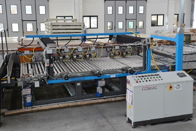 Linea di taglio e bisellatura per grandi formati, dal caricamento alla lavorazione. L'impianto totalmente automatico taglia e rifinisce le lastre di grande formato in piastrelle di diverse dimensioni.